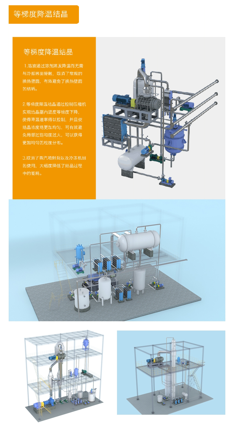 等梯度降温结畾技术是通过粘滞流压缩机作为钛液罐的抽气设备,罐体内溶剂水在真空条件下绝热闪蒸汽化,溶液降温及溶质结晶放热由水分蒸发汽化携热所平衡。压缩机抽出的二次蒸汽经压缩增温后通过循环冷却水进行冷却,凝水排至凝水權。等梯度降溫结皛系统运行时,料液罐内的料液在同高度位置处具有相同的温度梯度及浓度梯度,结晶过程不存在局部过冷而导致的晶疤问题,晶体粒度均匀。